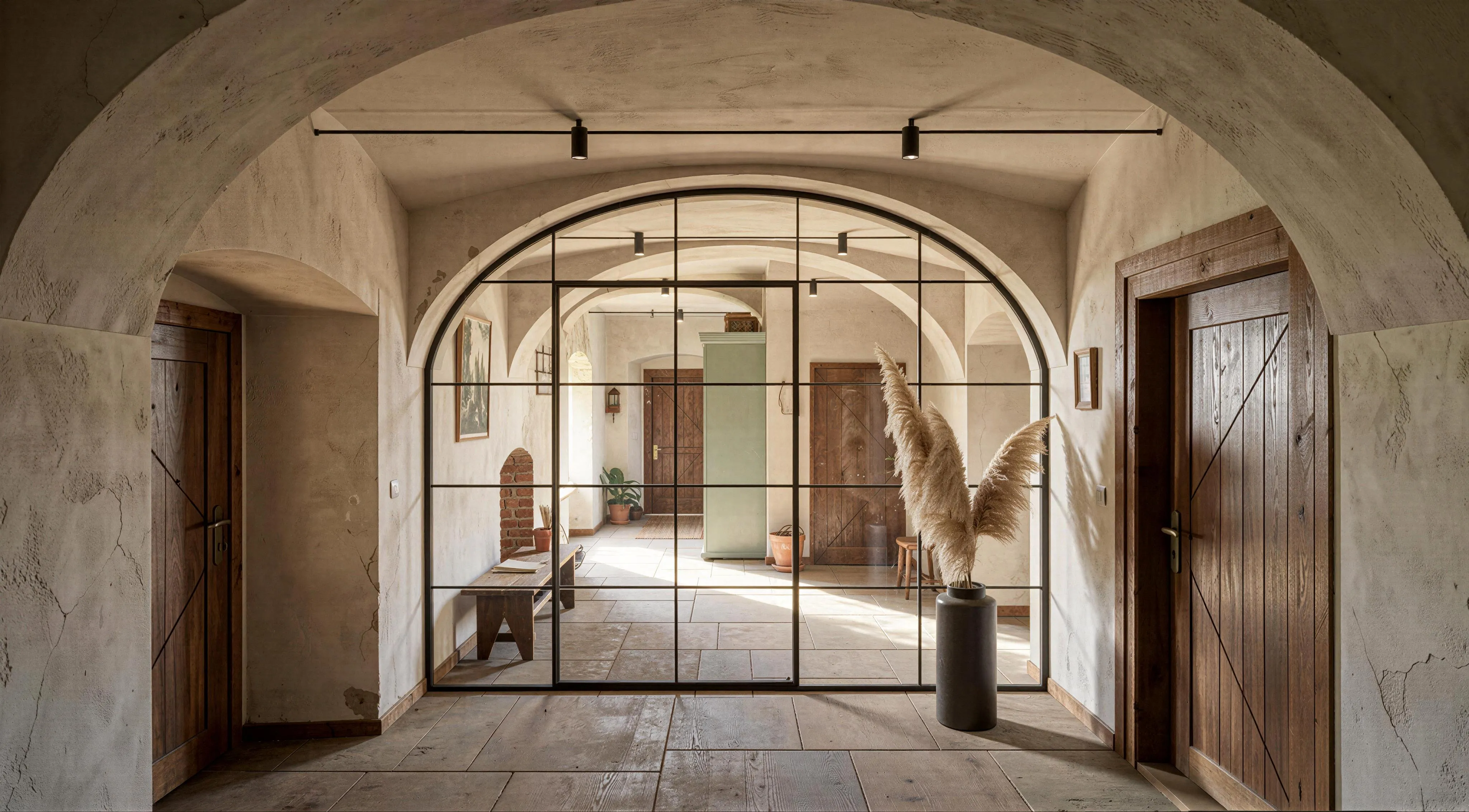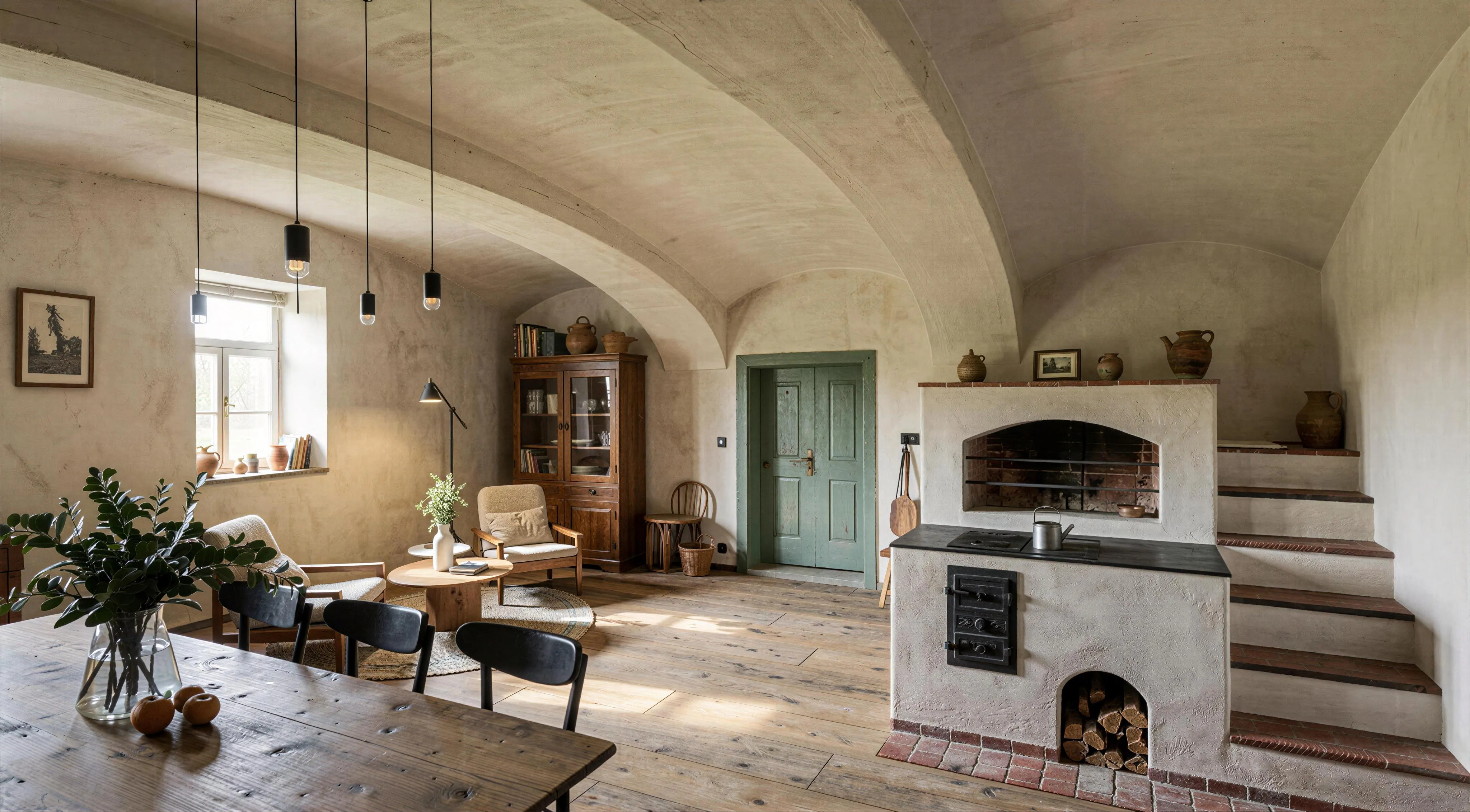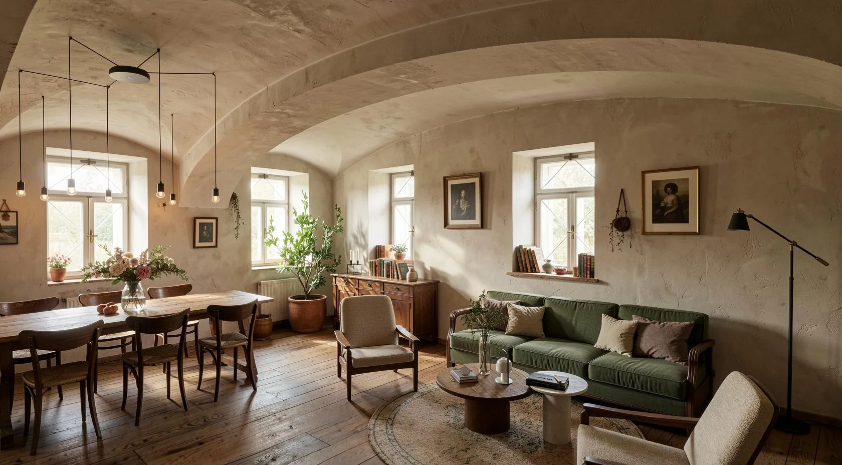 moderní kusy doplňují historický nábytek, těžká dubová podlaha, renovace omítek